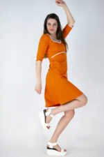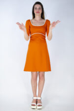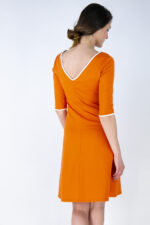 Die Taille rückt durch die Linie unter der Brust optisch nach oben und sorgt für lange Beine. Im Oberteil ist es anliegend, der Rock hat eine A-Linie. Der Ausschnitt ist großzügig, damit nichts verrutscht gibt es verdeckt eingearbeitete Clipse zur Befestigung am BH- Träger. Der Ausschnitt ist im Vorderteil eckig gearbeitet, im Rücken spitz zulaufend. Die Rückenpartie ist atemberaubend und zeigt viel Haut, der Ausschnitt endet jedoch vor der BH-Linie. Kombinieren Sie an kühlen Tagen einen unserer großzügigen Loopschals und Wendestulpen dazu.
