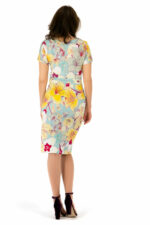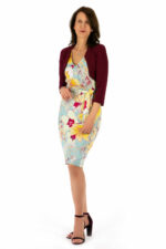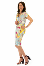 Das Kleid CARLOTTA ist ein sommerlicher Alltagsbegleiter mit schlanker Silhouette. CARLOTTA lenkt den Blick gekonnt auf den schönen Knoten, welcher der drapierten Taillienpartie entspringt. Durch den rückwärtigen Gürtel können Sie die Taillenweite regulieren. Das Kleid hat eine schmale Rockform und ist besonders geeignet für Frauen mit eher gerader Taille. Der V-Ausschnitt hat eine streckende Wirkung, was besonders den in nicht so hoch gewachsenen Frauen schmeichelt. Der Ärmel ist angeschnitten und sommerlich kurz.