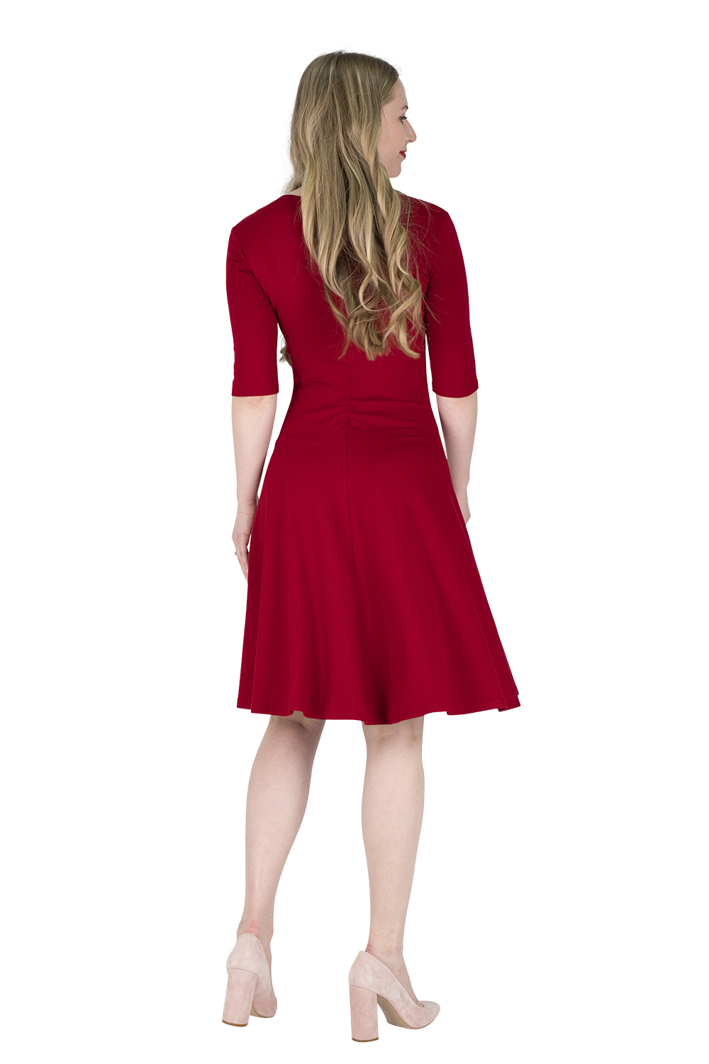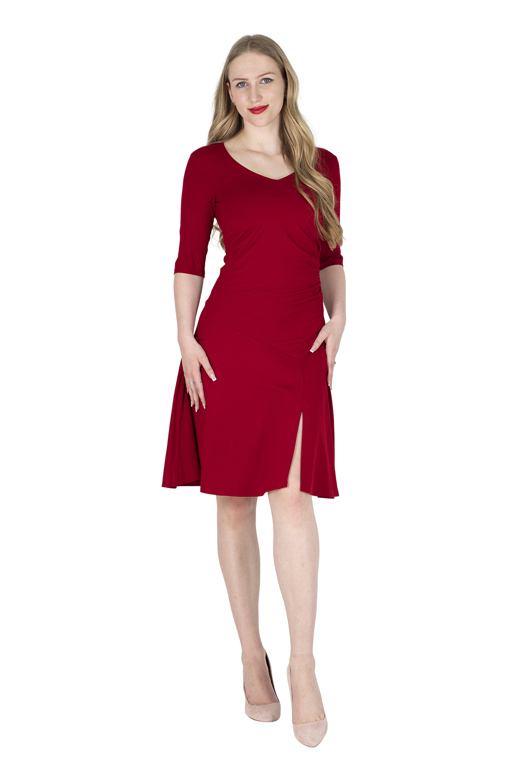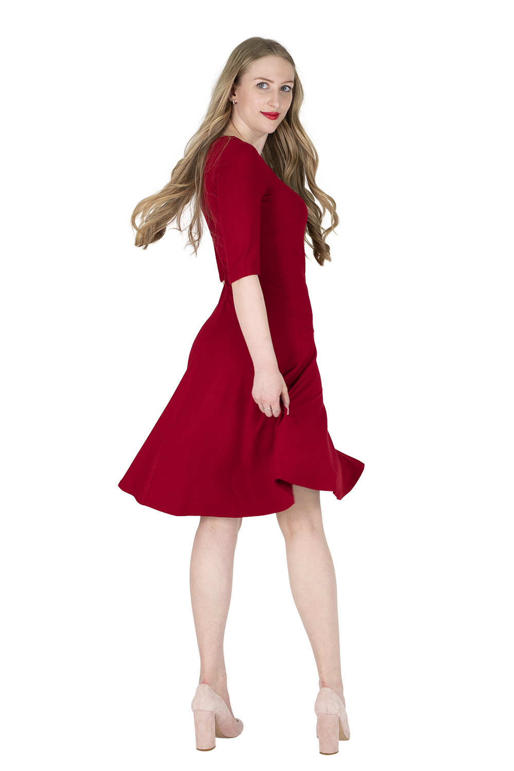Feuer, Leidenschaft und die Freude am Tanzen vermittelt unser Kleid KATLEEN. Das Vorderteil ist gefüttert und durch Asymmetrie und der seitlichen Raffung äußerst vorteilhaft. Der Ausschnitt lässt Platz für eine schöne Kette, er endet vorne und hinten in einer Spitze. Der Rücken hat eine Teilungsnaht oberhalb der Taille, dadurch wird die Figur optisch gestreckt. Die Rückenmitte ziert eine kleine Raffung, unterschiedliche Rückenlängen werden damit optimal aufgefangen. Das Rockteil ist ebenfalls dezent asymmetrisch, ein Schlitz in dem wunderbar weit schwingenden Rock zeigt in der Bewegung etwas Bein. Lebensfreude pur…!