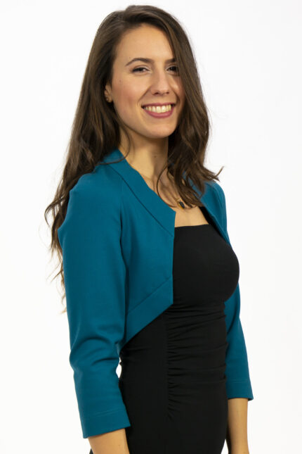 Mit ihrer weit ausgeschnittenen Vorderansicht und ihrer Länge bis zur Taille sorgt sie für Eleganz ohne die Silhouette des Kleids zu stören. Die kürzere Ärmellänge und die körpernahe Passform machen sie zum Allrounder für jede Jahreszeit und Gelegenheit. NELE kommt in vielen Farben daher und bringt so einen klassischen oder farbenfrohen Akzent in deine Garderobe. Sie lässt sich mit unserem Oberteil MONIQUE und dem Rock TESSA zum perfekten Ensemble kombinieren. Auch in Begleitung mit einer Hose sieht unser Bolereo NELE einfach unverschämt gut aus.