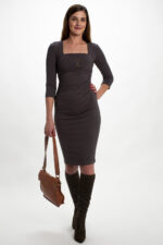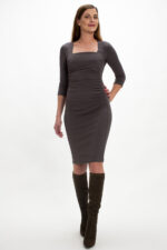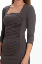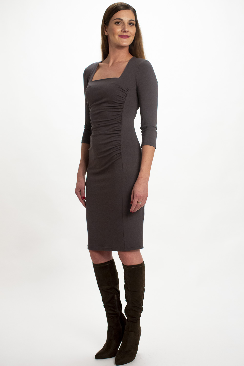 Unser schmales Basic-Kleid. Der Schnitt zeigt viel Liebe zum Detail. Die Raffung im Vorderteil kaschiert weibliche Rundungen perfekt. Die formgebenden Längsnähte strecken die Figur. Im Rücken gibt es in der Taille eine kleine Raffung. Die Passenabtrennung im oberen Bereich ist nicht nur dekorativ sondern auch perfekt platziert. Sie kaschiert die darunterlegende BH-Linie perfekt!