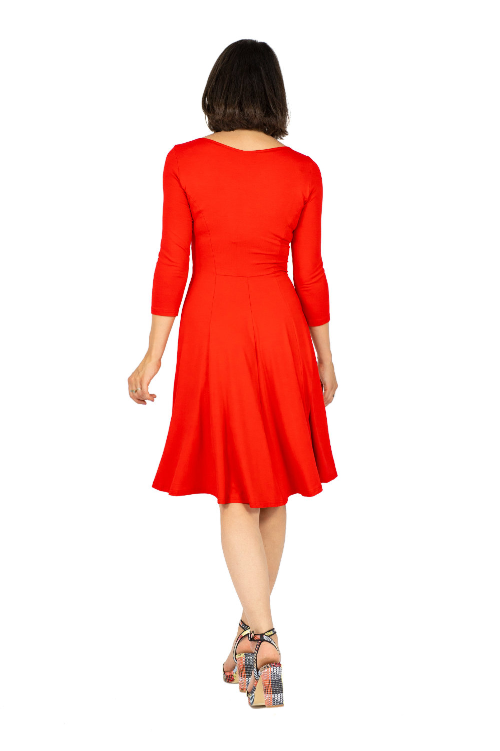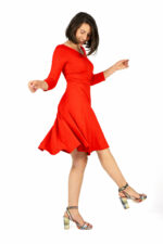 Der außergewöhnlich schöne Ausschnitt setzt ihr Dekolleté in Szene. Prinzessnähte sorgen für eine optimale Passform und strecken die Figur. Der raffinierte Gürtel Wendegürtel zaubert eine Wespentaille. Für eine ruhigere Vorderansicht kann der Gürtel auch im Rücken getragen werden. Weibliche Hüften werden von dem glockigen Rock weich umspielt. Der Saum hat eine schwingende Weite und lädt zum Tanzen ein. Die Ärmellänge ist dreiviertel lang.