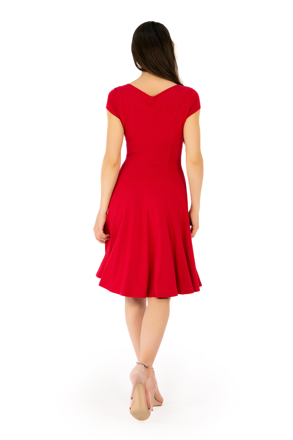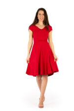 Der außergewöhnlich schöne Ausschnitt setzt ihr Dekolleté in Szene. Prinzessnähte sorgen für eine optimale Passform und strecken die Figur. Der raffinierte Gürtel Wendegürtel zaubert eine Wespentaille. Für eine ruhigere Vorderansicht kann der Gürtel auch im Rücken getragen werden. Weibliche Hüften werden von dem glockigen Rock weich umspielt. Der Saum hat eine schwingende Weite und lädt zum Tanzen ein. Es hat einen sommerlichen Kurzarm.