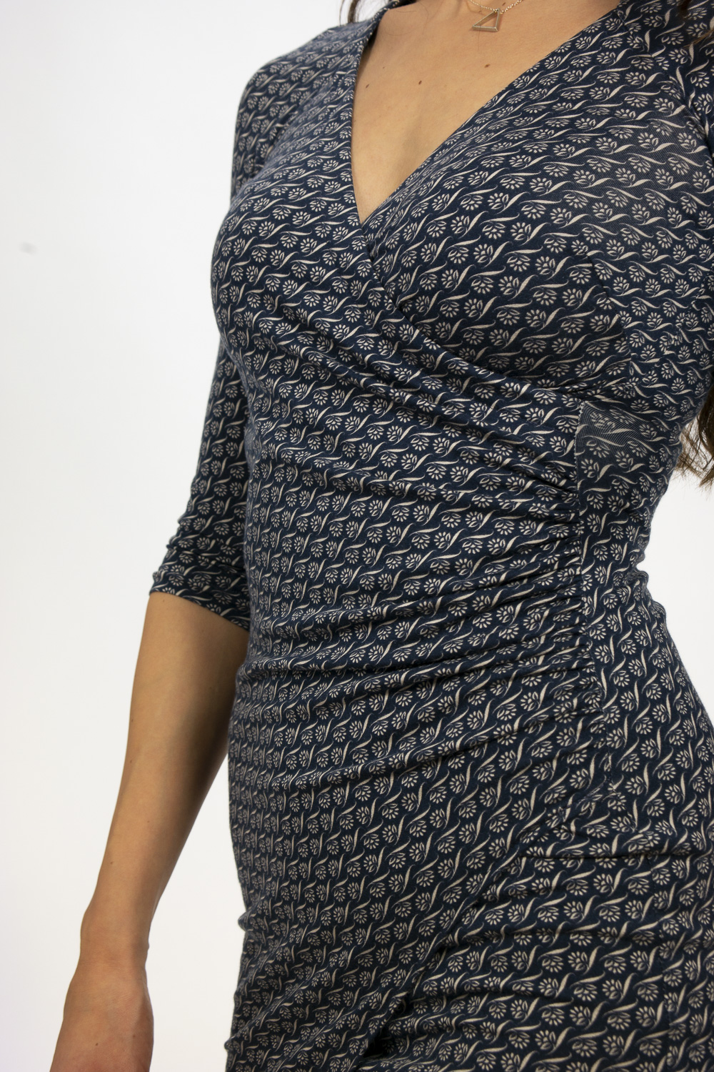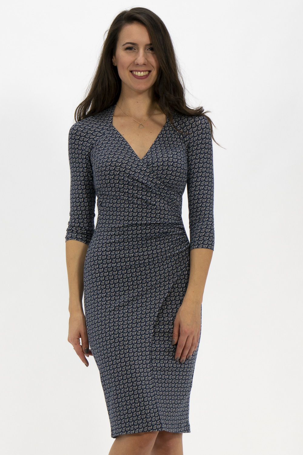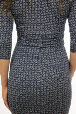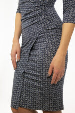 SYBILL begeistert durch aparte Wickeloptik und einseitige Raffung. Die Asymmetrie schafft eine spannungsreiche Linie, da schaut man gerne zweimal hin. Kleine Unregelmäßigkeiten werden gekonnt umspielt. Der Ausschnitt hat eine besonders schöne Form, er ist im Nacken hoch geschlossen und öffnet sich nach vorne äußerst dekorativ. Dadurch streckt er die Halspartie. Der Ärmel ist dreiviertel lang und hat eine Raglanform. Damit ist es auch für breitere Schultern sehr gut geeignet. Den Rücken ziert die Raglanabtrennung und eine kleine Raffung in der Taille.