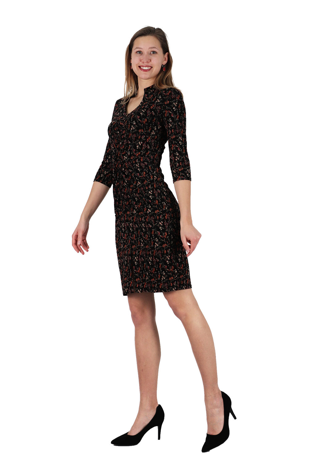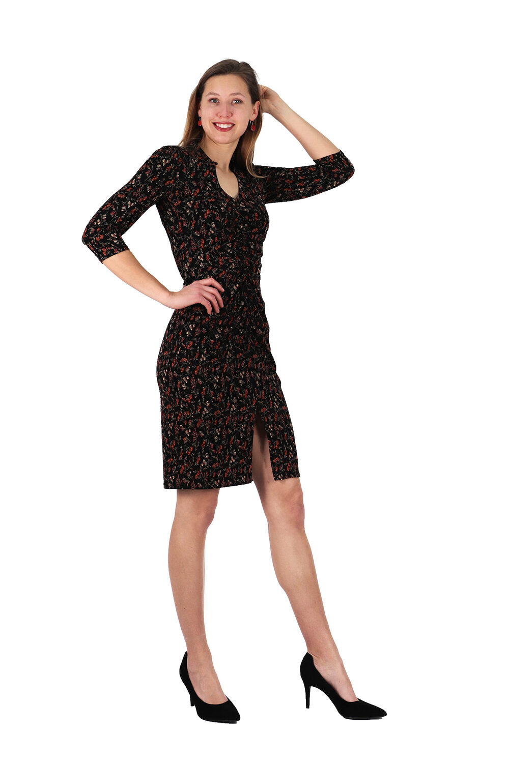 Es ist figurbetont aber nicht hauteng. Die Raffung im Vorderteil kaschiert gekonnt die eine oder andere weiblichen Rundung. Der Rock ist schmal und hat vorne einen Schlitz.